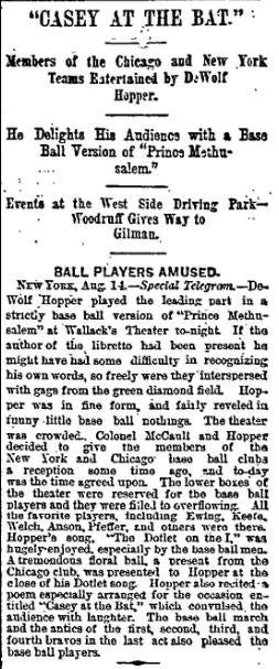 De Wolf Hopper was appearing at Wallack’s Theater in New York City in a comic opera called Prince Methusalem. He was not then the public institution he has since become, but just a rising young comedian for whom “Wang” had not yet been written. However, even then, he had a wide circle of acquaintances, of whom Mr. Gunter was one. It chanced that one morning, as he was looking over the paper, Mr. Gunter saw the announcement that the New York and Chicago baseball clubs were to be at Wallack’s that night as Mr. Hopper’s guests. He bethought him of “Casey at the Bat,” hunted up Mr. Hopper and gave it to him with the suggestion that he recite it. He added that it was a really great poem and was certain to