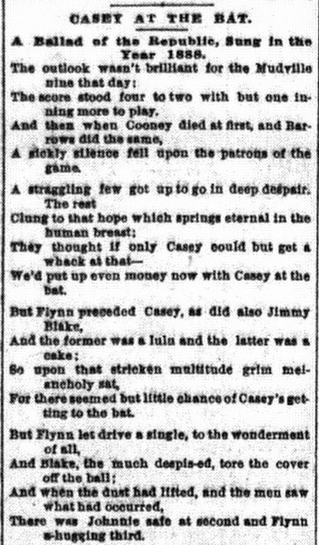 Valentine and I were roommates. My brother Walter sent me a set of Macaulay’s works and one Sunday evening, reading “Horatius at the Bridge,” I said to Valentine that here was a good opportunity to parody “Horatius” by a poem about a Mick at the Bat. We were then baseball crazy. Valentine read the Macaulay poem and went ahead and wrote a piece he called “Casey at the Bat.”